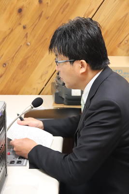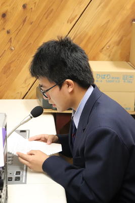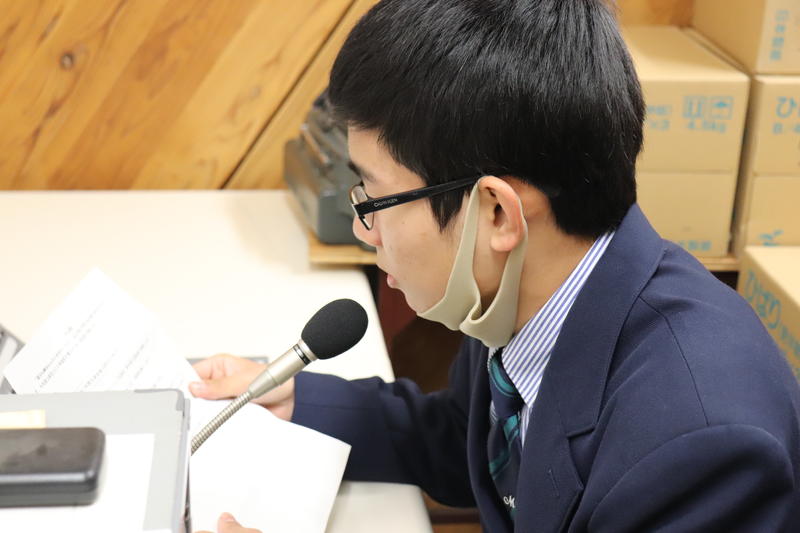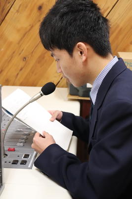 生徒会交代式の放送。司会は2年機械科・豊永眞大君(新副会長)