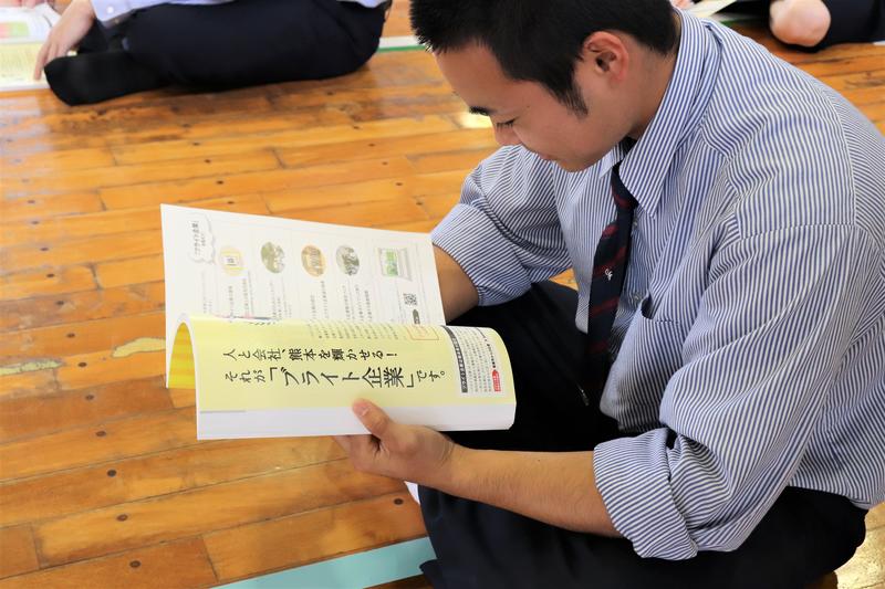 「熊本ブライト企業パンフレット」を見ながら、進路指導主事の話を聞いているところです。