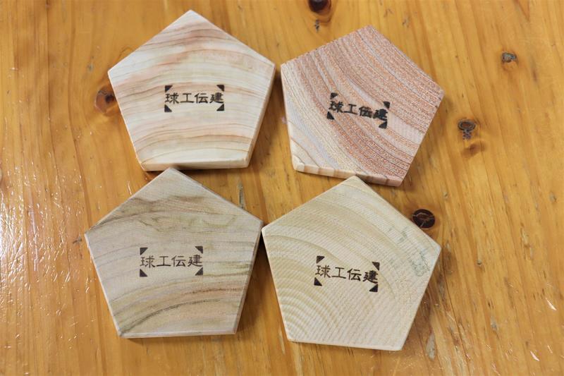 【建築科】鉋体験をした中学生にはコースターをプレゼント。五角形は合格(ごうかく)にかけてあります。素材は樟(くす)、桧(ひのき)、杉、銀杏です。それぞれ香りが違うよ。