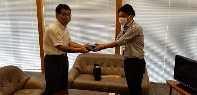 8月4日(火)10時30分より、第一生命保険(株)様より生徒の役に立つようにと学用品(関数電卓・製図道具一式)の寄贈がありました。来校されたのは、オフィス長代理の髙地様と本校の2年生の保護者の甲斐様です。