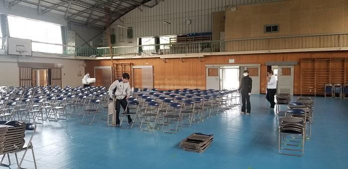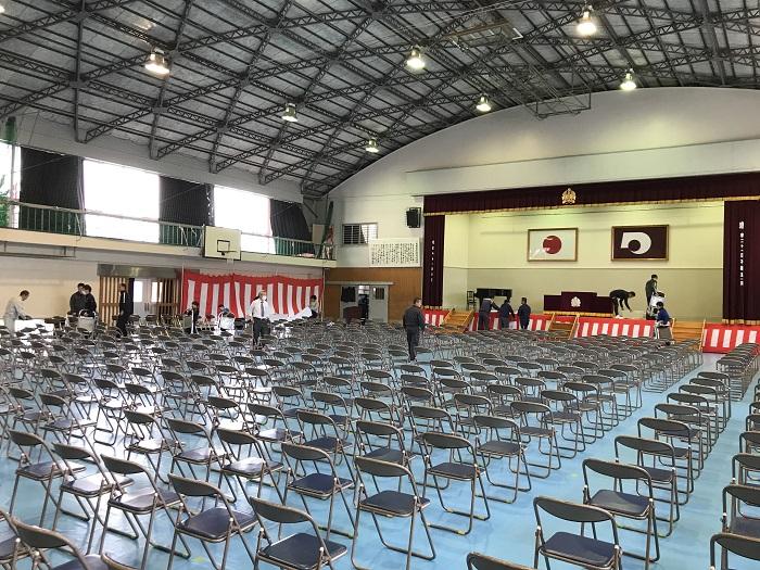4月6日(月)15:30から、令和2年度(2020年度)の入学式の設営を全職員で行いました。初めて職員のみで設営をしましたが、職員の手際が良くシート敷きや椅子並べ、看板や紅白の幕の設営など、1時間程度で完了しました。