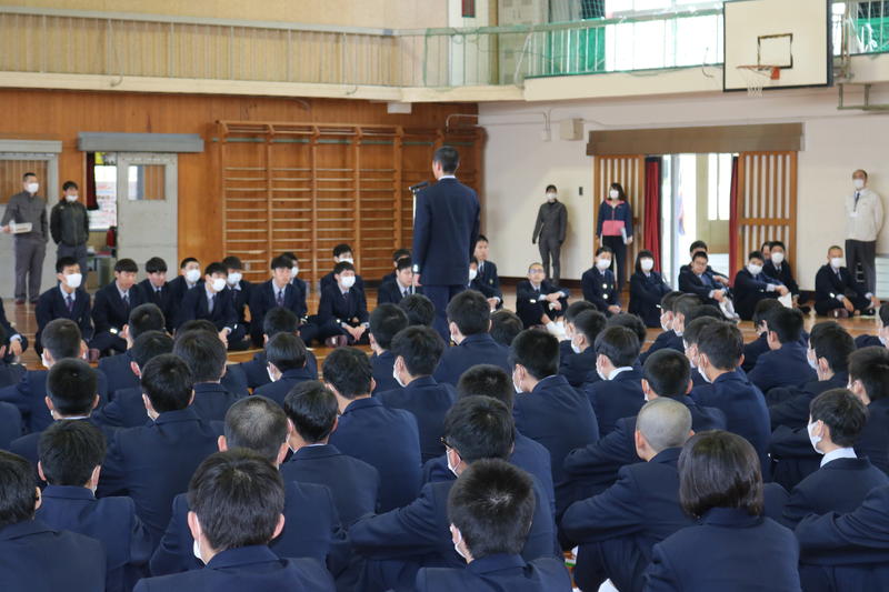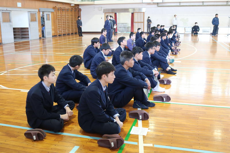 体育館で、後期(一般)選抜の「受検上の注意」が行われています。