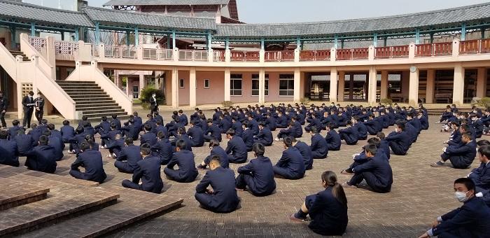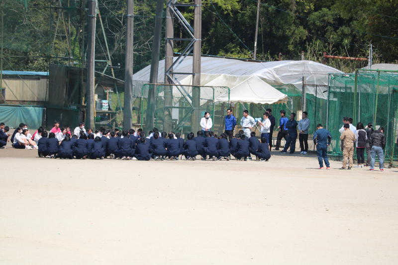 できるだけ生徒一人一人の間隔を広く取り、普段とは違う場所での集会でしたが、生徒達は「密集した状態ではなかったので、安心して参加できました。天気も良く少し暑く感じましたが、心地よい風が吹いて気持ちよかったです」と感想を述べてくれました。