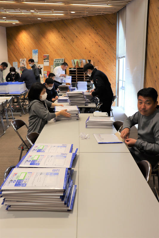 三密にならないように気をつけながら資料を封筒に入れています。