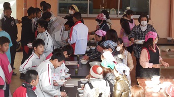持久走を終え疲れて帰ってきた生徒達も、温かい豚汁に大喜び。『うまい!、生き返る!』と言って笑顔で食べていました。保護者も、『仕事を休んで作った甲斐がありました。こんなに喜んでくれて嬉しい!』と、その笑顔に癒やされていたようでした。