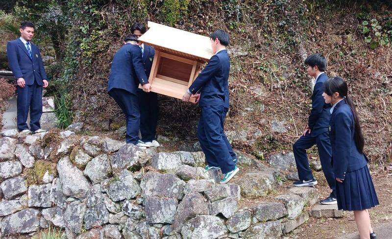地域貢献班のメンバー8名で1年間取り組んできた、八代市泉町の『加藤清正公祠』の設置作業を行いました。