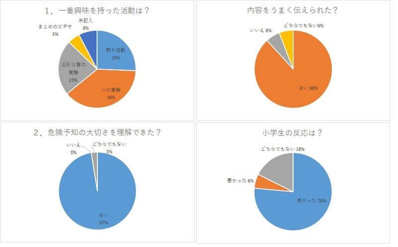 小学生諸君は「川の模型実験」が一番人気だったようです。また,「防災教室」を通してほとんどの小学生が危険予知の大切さが理解できたと回答しています。今回の目的を達成できたようです。