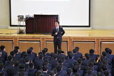 そこで、3学期第一回目の学年集会では、本校OBの中村隆史さん(人吉第二中学校卒)をお呼びして「社会人になって感じたこと」「高校生のうちに考えておいて欲しいこと」などをテーマにお話をしていただきました。