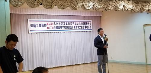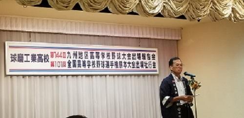 7月6日(土)18時からパルティール福寿庵において、「第144回九州地区高等学校野球大会出場報告会」と「第101回全国高等学校野球選手権熊本大会出場壮行会」が、行われました。陵和会からは、和田会長を始め10名が参加し、野球部・保護者・野球部OB・職員・陵和会で総勢158名の参加で盛大に行われました。
