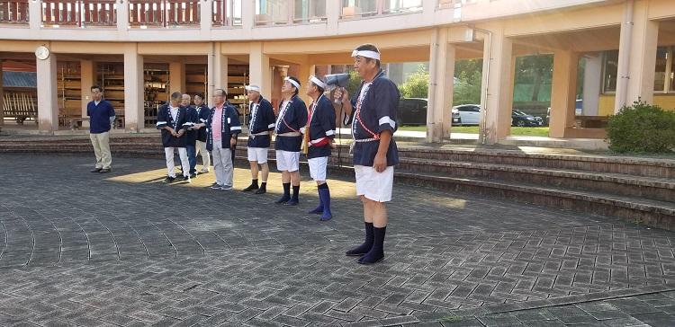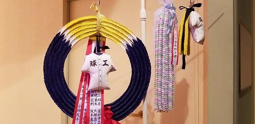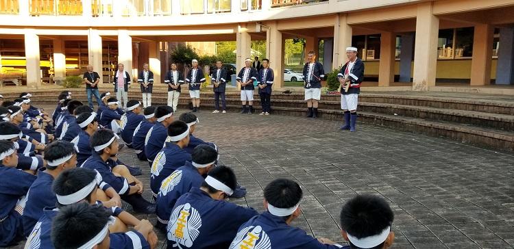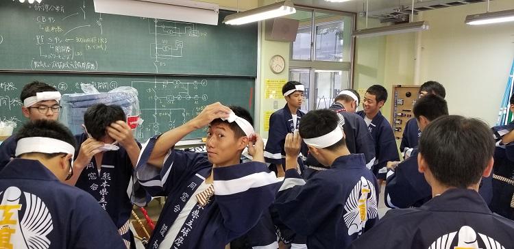 10月2日(火)の放課後、おくんち祭の神輿担ぎの練習が陵和会(同窓会)の方々の指導により行われました。会員の方々は、14時に来校され神輿の飾り付けをされた後、生憎の雨だったため実習棟の廊下で16時より1時間程度、生徒86名を指導していただきました。