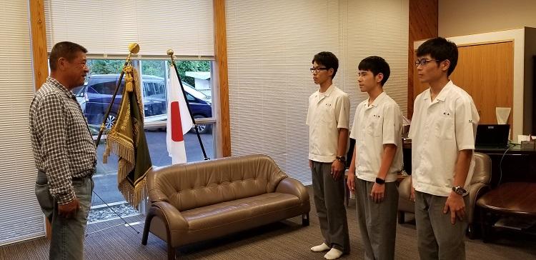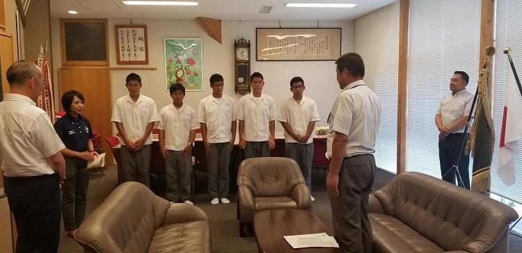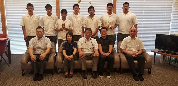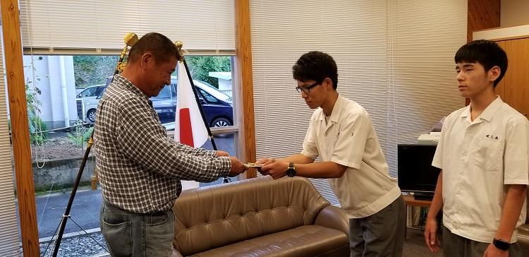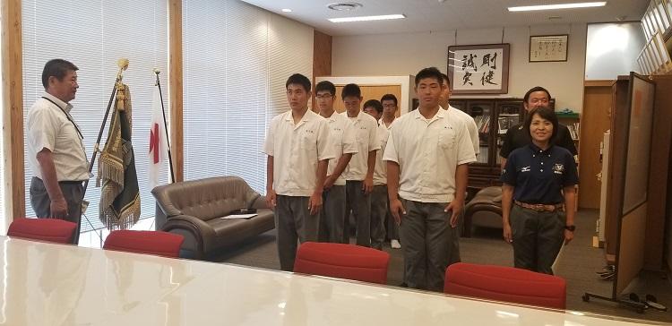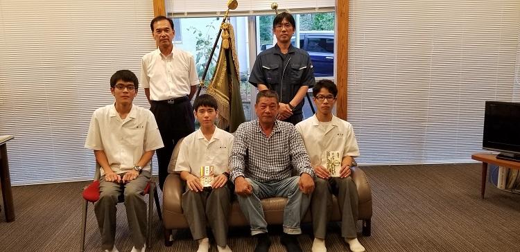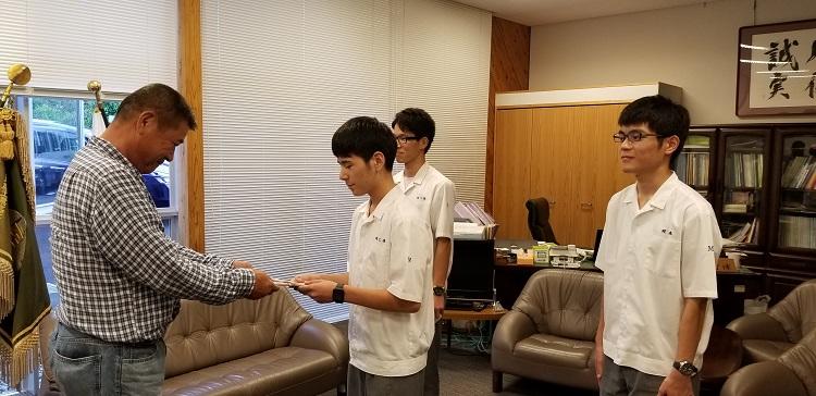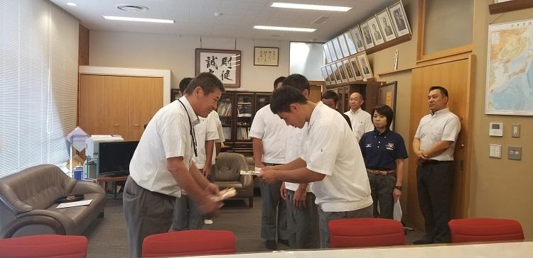 令和元年7月29日(月)AM9時より、本校校長室において陵和会(同窓会)より、インターハイに出場するカヌー部(5名)と陸上部(2名)に和田榮司会長より奨励金の授与がありました。