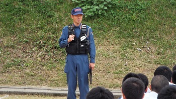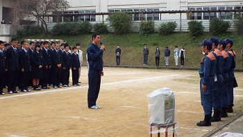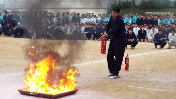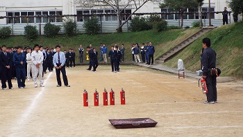 西校長が講評をされた後、人吉市下球磨消防組合の大塚様より講評をいただきました。その後、人吉防災の坂本様より消火器の取り扱い方の説明を受けた後、3年の各クラス代表5人による消火実演が行われました。