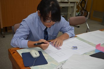 2年生の製図では、現在『jw.cad』ソフトを利用してパソコンで住宅の平面図を描いています。製図は手書きが基本ですが、現場ではCADソフトを使った図面が主流です。検定もあるのでみんな頑張っています!