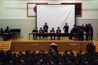 交代式では、新生徒会長の石川君、新生徒会副会長の出水田君と星子君が