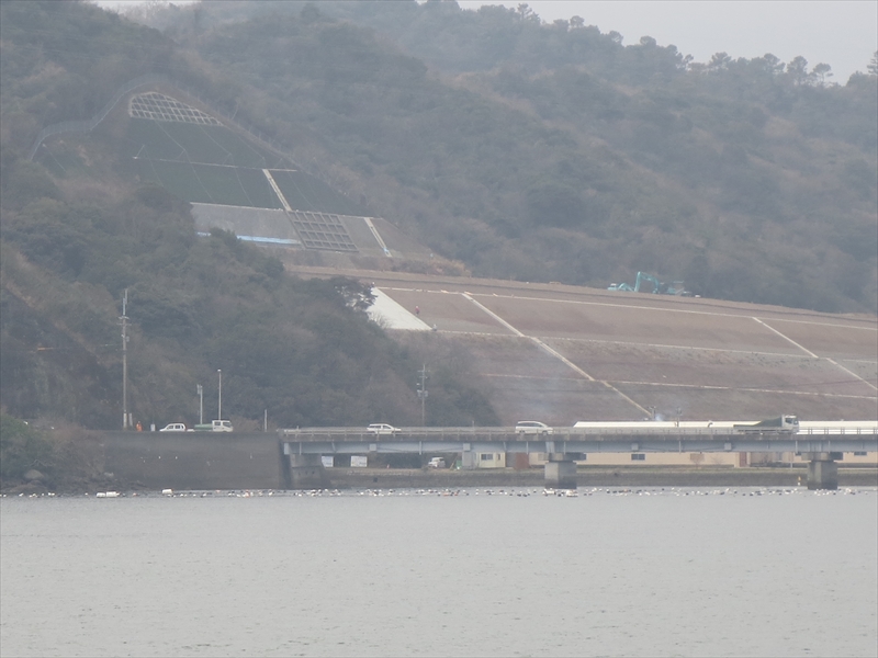 【左上の画像】左が供用中の天門橋、中央が新天門橋に続くアプローチ橋、右の法面にはバイパスが建設中です。