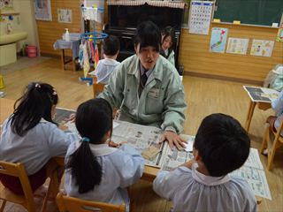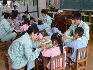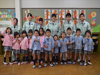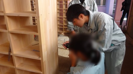 12月9日(水)の午後から建築科3年生の授業「課題研究」の木育班(6名)で学校の近くの人吉中央幼稚園へ行きました。今回は2回目の木育教室です。前回の教室で分かった課題を克服できるように改善してきました。
