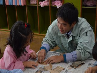 年長さん12名と一緒に「森のかけらのお守り」作りをしました。今回使用した木は8月の台風で倒れた杉の木を利用しました。ザラザラしている木のかけらに粗さの異なるやすりで何度も擦り、ツルツルのお守りを作ります。子ども達はプレゼントしたい人を思い浮かべながら一生懸命やすりをかけていました(^v^)「疲れた~」と言いながらも、徐々に木の木目がはっきりし、ツルツルになっていく様子に満足そうでした。初めはお互いに緊張していましたが、最後は満面の笑顔で終えることができました。