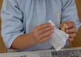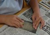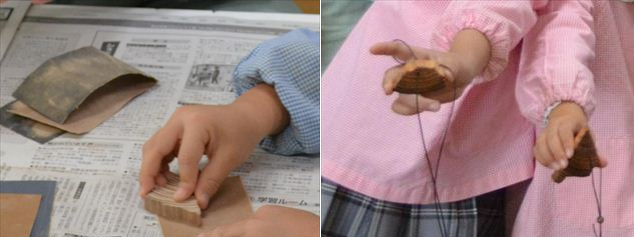 粗さの異なる6枚の紙やすりを使用して、ざらざらしている木のかけらをツルツルに仕上げていきます。子ども達は木の香りを楽しみながら一生懸命に取り組んでいました。中には頑張りすぎて木の粉が顔についてしまう子も…(*^_^*)