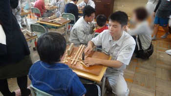 アミアミ椅子,折りたたみテーブル,縁台の中から一つ選択していただき、本校建築科の生徒とペアで作業します。みんな楽しそうに、一生懸命作業をして全員完成することができました‼