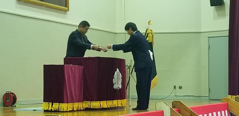 陵和会会長賞を受取る生徒会長の椎屋君