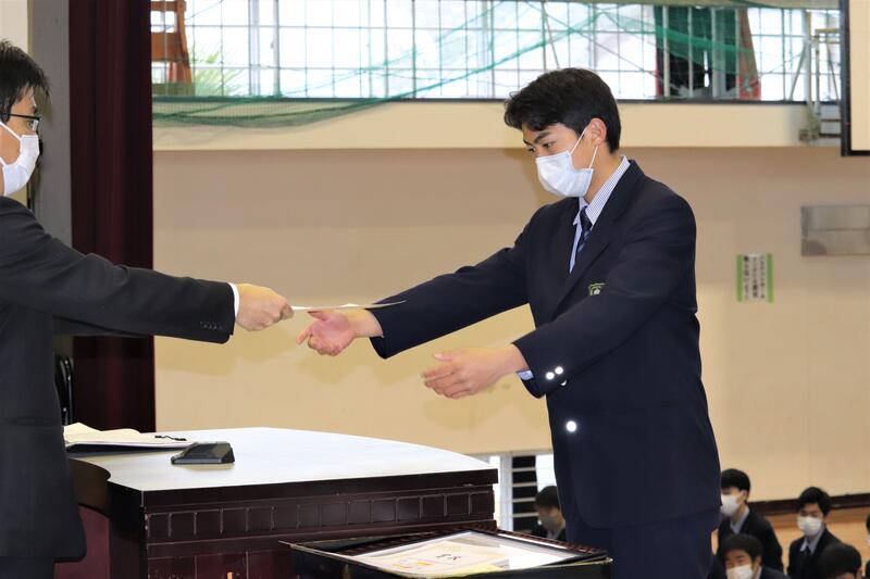 学校の表彰式では代表生徒に賞状をお渡ししました。