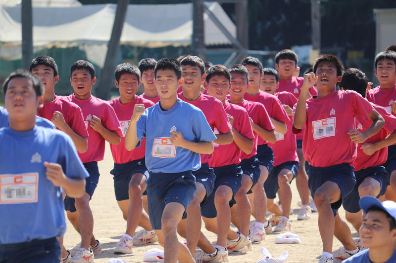 太鼓を任されて緊張気味です。生徒の動きを見ながら太鼓をたたきます。