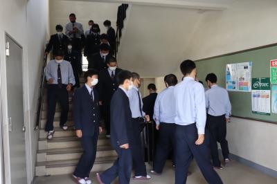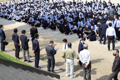 令和2年7月豪雨からまもなく1年を迎える4月30日(金)に1年生の避難経路確認を目的とした避難訓練を行いました。全校生徒の集合・点呼後、校長先生、防災主任、生徒指導主事からの講話を行い、日頃の生活の過ごし方や防災に対する意識の向上を呼びかけました。