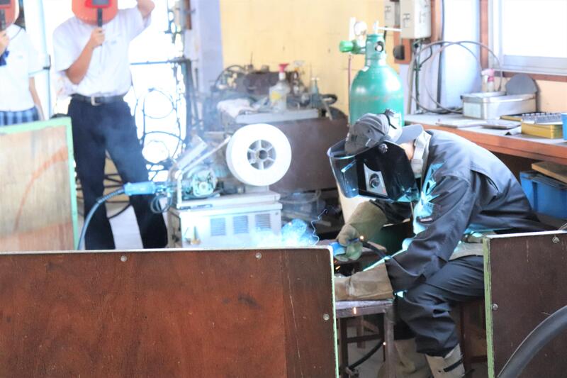 溶接の様子。直接光を見るとまぶしすぎて危険ですので、中学生は目をガードしています。もちろん溶接をしている人も。
