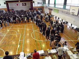 平成30年度入学の合格者招集が本校体育館で行われました。教頭挨拶から始まり教務部・事務部。保健体育部・生徒指導部・旅行会社より各種説明を受けた後、教室に移動し、各連絡と提出書類集めがありました。生徒も保護者の方も、聞き漏れが無いように話を聞いておられました。その後、体育館に再度移動し、物品購入をしていました。4月9日入学式でみんなと会えるのを楽しみにしています。私たち職員は、皆さんの目標達成に向けて精一杯お手伝いさせていただきます。一緒に頑張りましょう!
