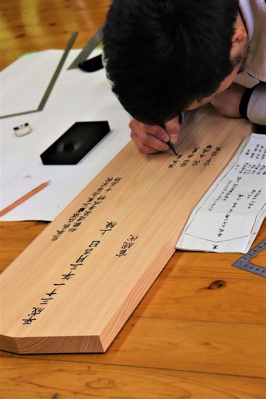 写真は、修復した本殿に取り付ける棟札(むなふだ)を書いているところです。