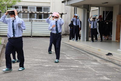 今回は、頭上からの落下物を想定し、身近な本などで頭を保護しながら避難する点が加わりました。