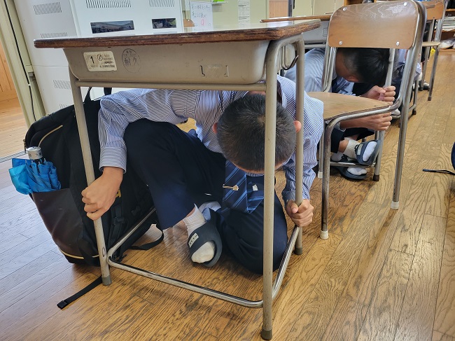 10月20日(金)の朝のSHRの時間に、シェイクアウト訓練が実施されました。生徒達は真剣に取り組んでいました。