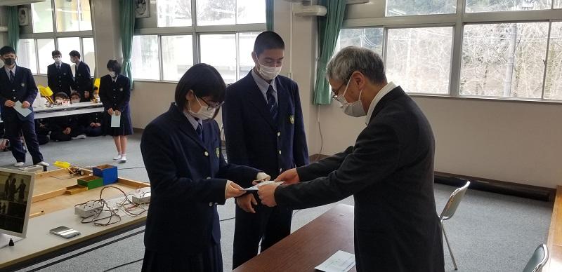 優勝したのは、中村くるみ(あさぎり中出身)さん・西啓永(錦中出身)君の『ショベル丸』、準優勝は愛甲凜(あさぎり中出身)さん・岩坂幸祐(相良中出身)君の『パルプ』、生徒達の投票でユニーク賞に決定したのは、上田来夏(人吉二中出身)君・大岩葵(球磨中出身)君の『スカイソング号』に決定しました。
