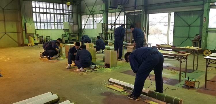 12月17日(火)4~6時間目の課題研究の時間に、人吉職業訓練所にある倉庫で、竹灯籠製作を行いました。この竹灯籠は、人吉商工会議所・青年部の企画で、2月8日(土)に人吉市鍛冶屋町で「点灯式」が行われますが、1本の竹に6~35mmの穴を100~200個開ける根気のいる作業です。