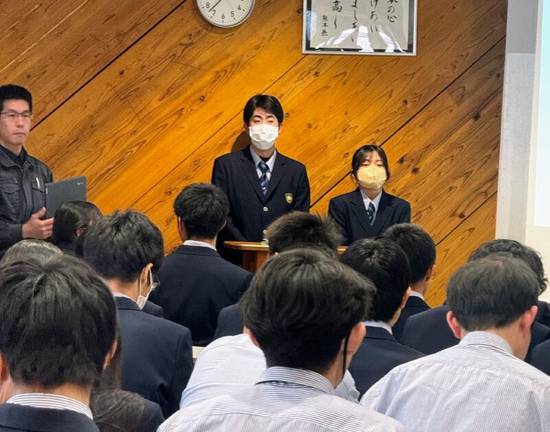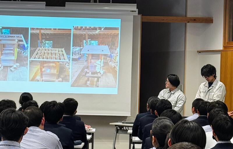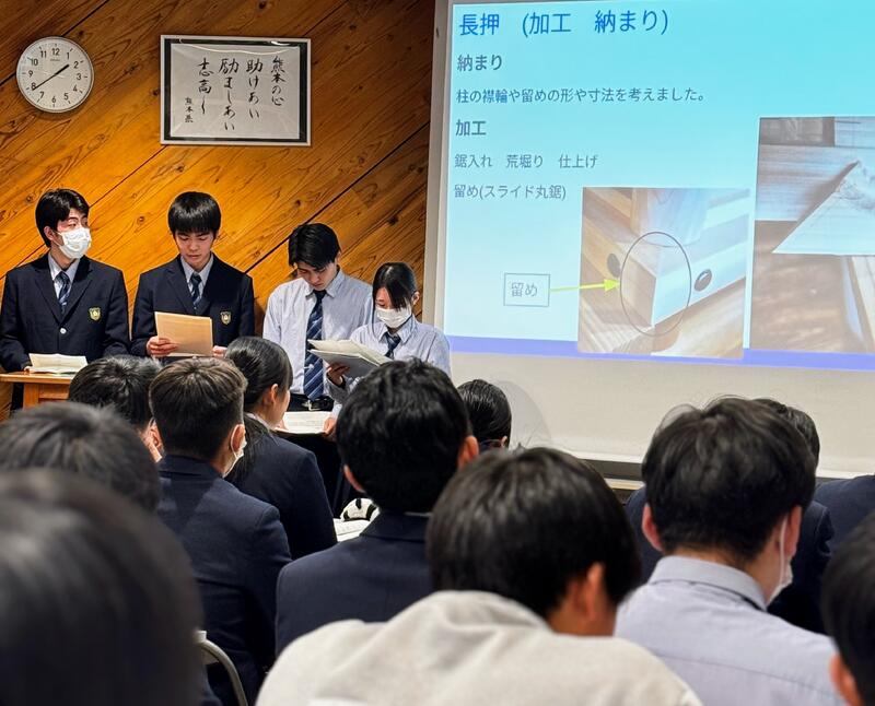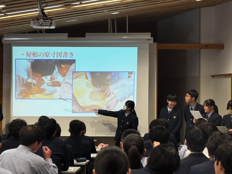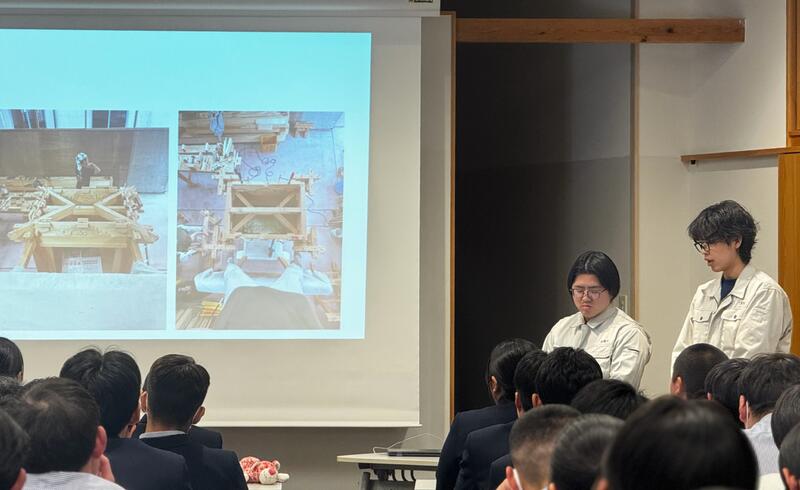 発表では、図面作成や加工の過程で直面した課題、仲間と協力して製作を進めた工程などが詳しく紹介されました。スライドに映し出される一場面一場面には、これまでの試行錯誤や苦労が表れており、実習の積み重ねが感じられる内容でした。