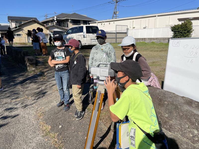 御溝川沿いで,測量機器を使って同じ高さに糸を張って地形を調べました。