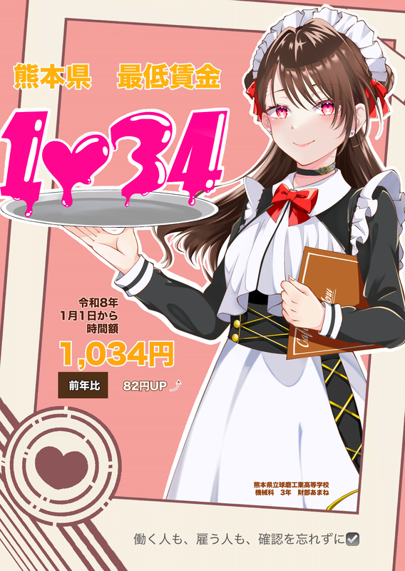 この企画は、2026年1月1日より熊本県の最低賃金が1034円になることを広く周知するために、高校生がポスターや書を作成するというものです。本校からは3年生の財部さんがポスターを作成しました。
