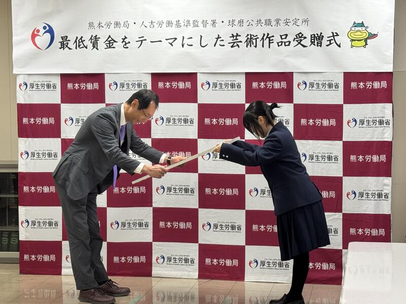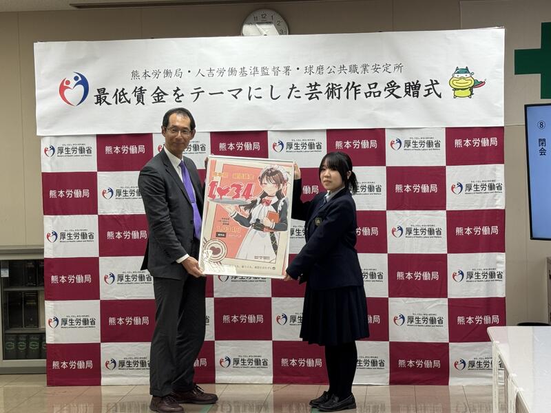 本日、最低賃金をテーマとした作品の受贈式が人吉の労働基準監督署で行われました。