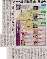 全長約250キロのこの道沿いから、ノーベル賞受賞者が相次いでいるということで、この国道41号線は別名「ノーベル街道」と呼ばれているそうです。日本でノーベル賞を受賞した方の生家の何と3分の2が41号線脇にあったそうです。右はネット上で見つけたそのことを報じる新聞記事です。偶然にしてはとても神秘的ですよね。