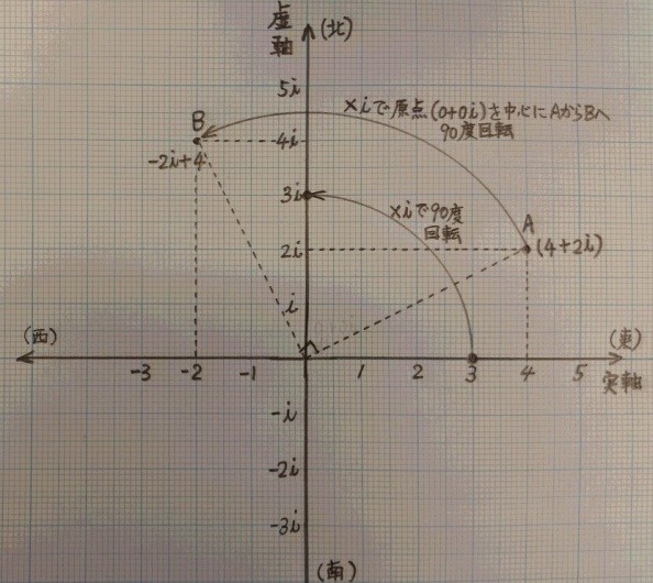 「東に3im進むということは北に3m進むということ? ~ iをかけると90度回転 ~」というタイトルの下、ざっと次のようなことが書いてありました。