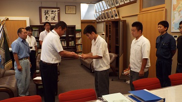 10月13日(金)16時より、球磨工業高校・校長室において、全国大会へ出場する伝統建築部と溶接部ロボット班へ、陵和会会長・和田榮司様より奨励金が授与されました。