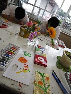 「画用紙ボードに金箔を貼り、その上に花を描く」