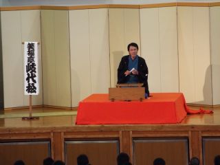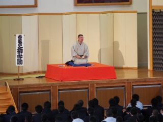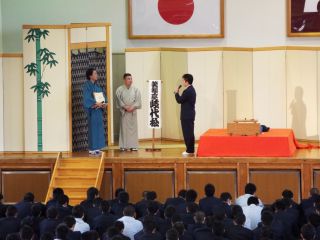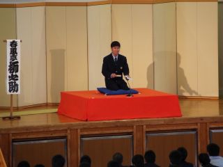 生徒及び職員代表として4名が落語を体験するコーナーもあり、