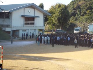 生徒はそれぞれの活動中の場所からハンドボールコートに避難しました。