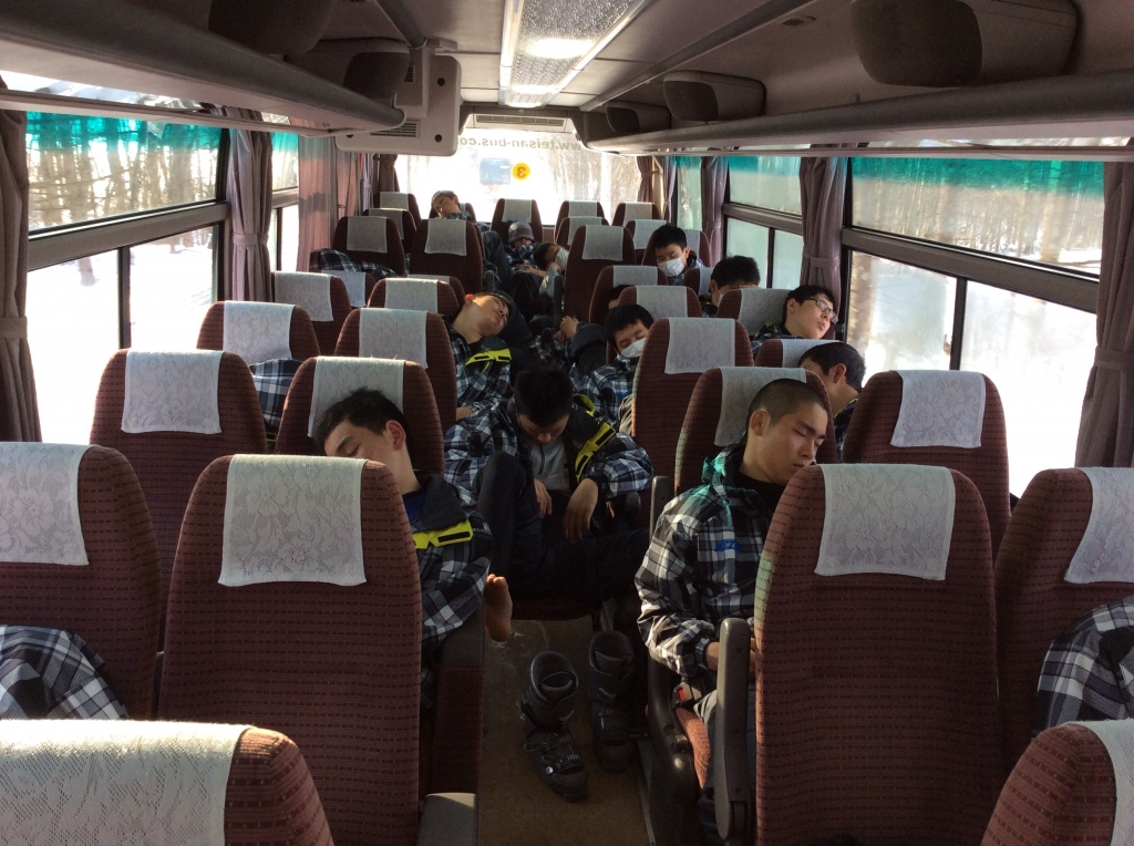 その後、一路東京へ。バスに乗り込んだ生徒たちは、くたくたに疲れ果てて眠りこけており、その顔は雪焼けで真っ黒になっていました。