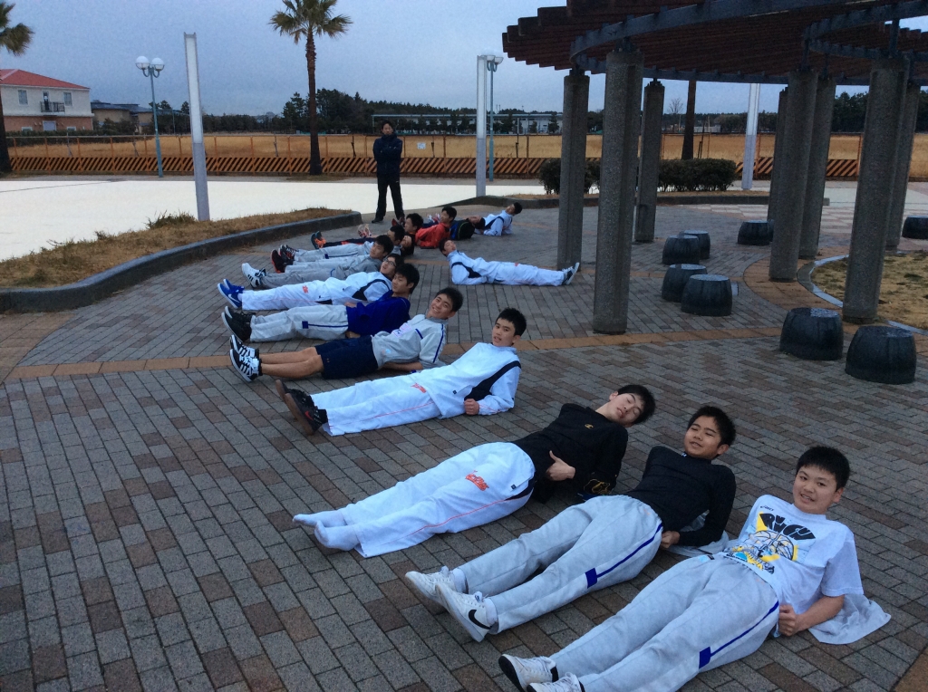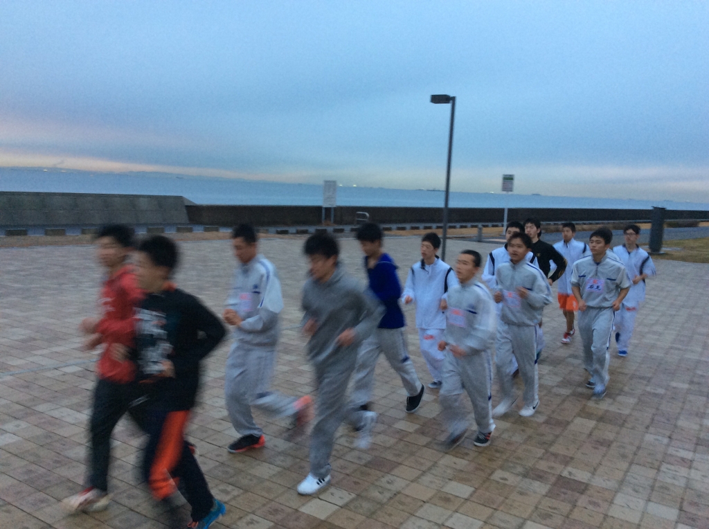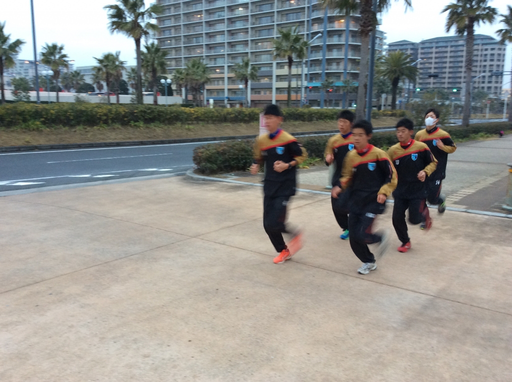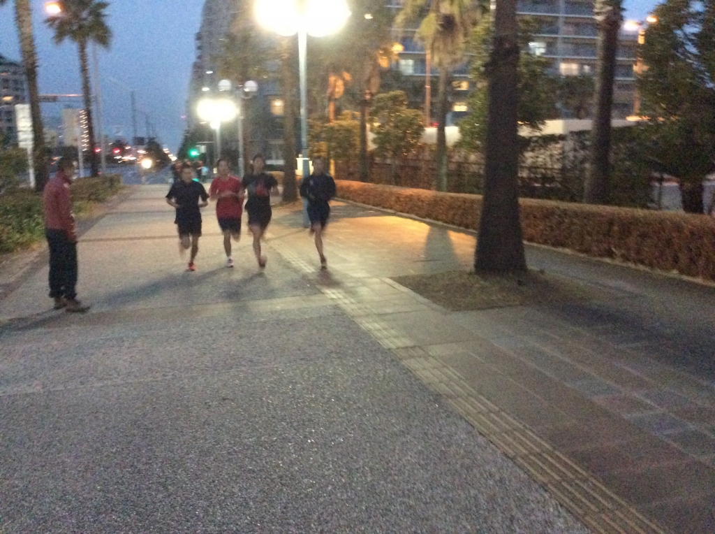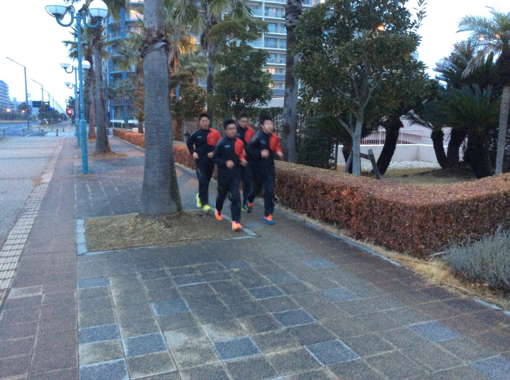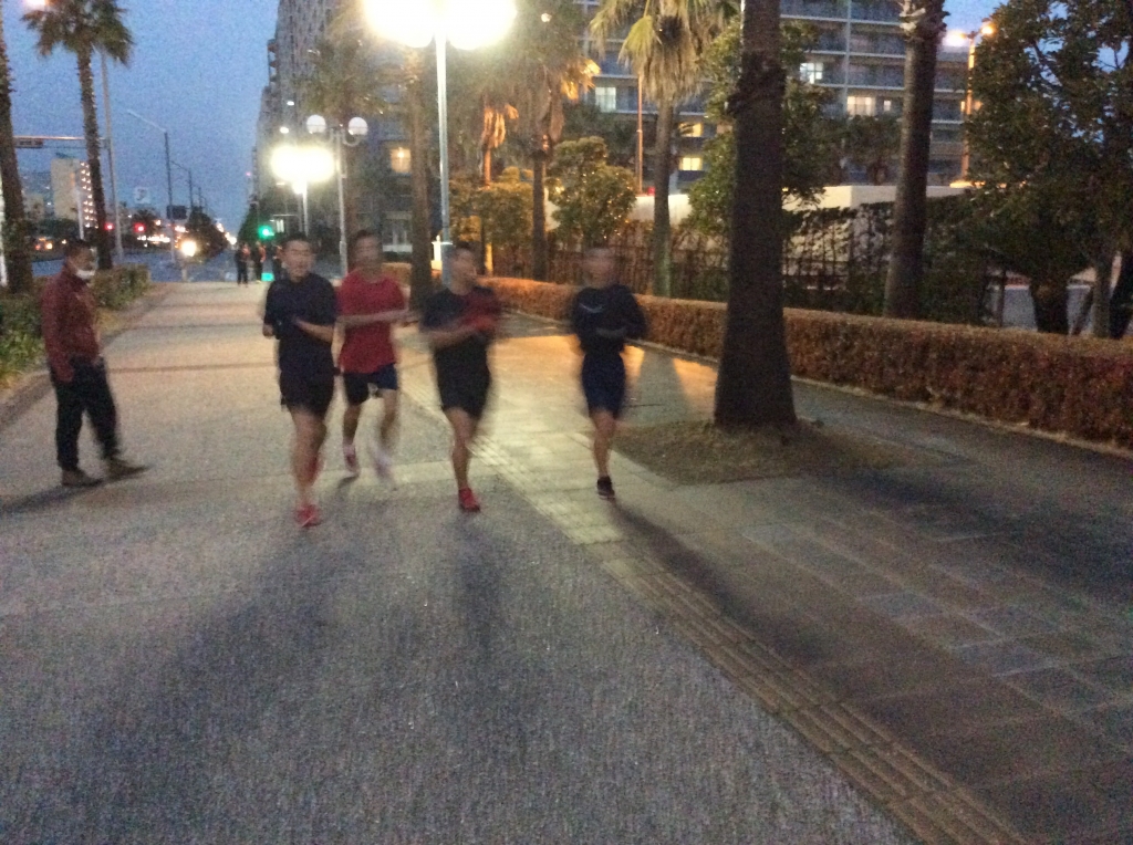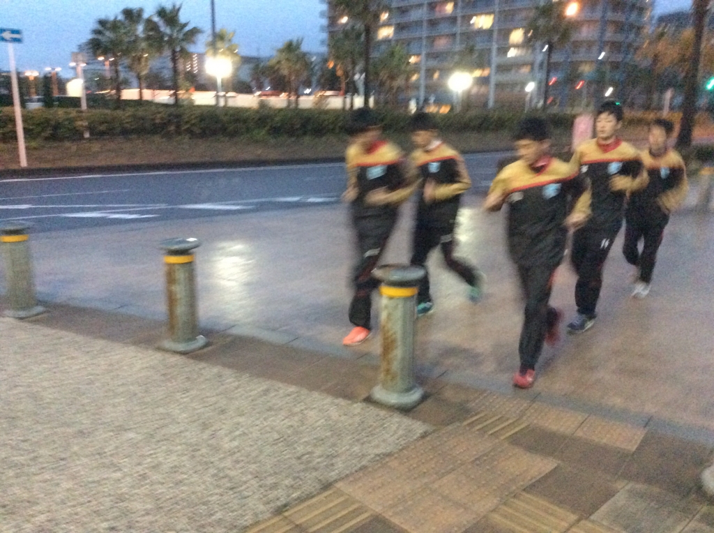 千葉浦安の朝。ホテルの外回りを走る陸上競技部、サッカー部。