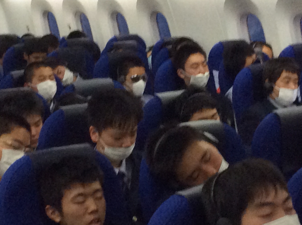 羽田空港で搭乗手続きを済ませた後は、やっと帰れるという気持ちとまだ修学旅行を続けたいという気持ちが交錯し、生徒の中には複雑な思いもあったようです。多くの生徒にも疲れが見え始め、搭乗を待っている間は静かに座り込んでいたりそのまま眠ってしまったりする生徒も少なくありませんでした。飛行機の中でも静かな様子で、大人しく鹿児島空港に到着する時を待っていました。
