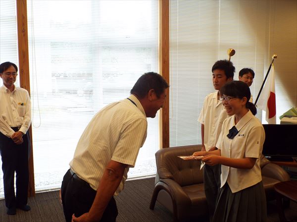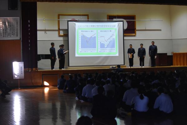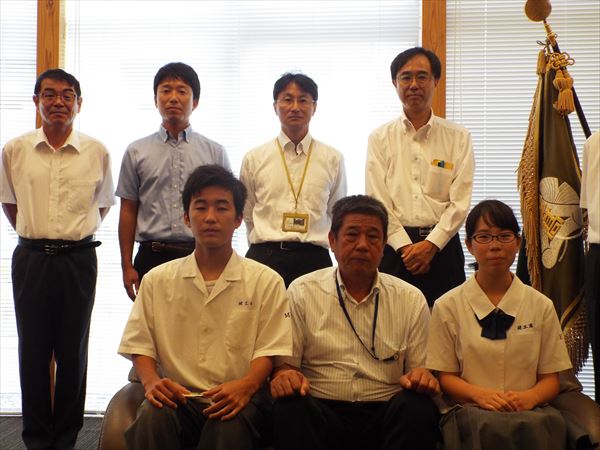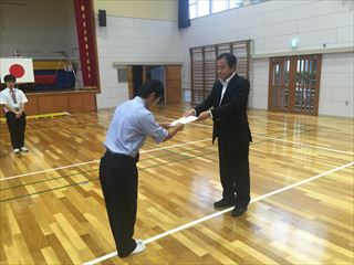 アイディアロボット全国大会の出場と電気科2年園田さんが海外インターンシップへの参加に向けて、同窓会から奨励金が授与されました。10月23日~29日の間、県内企業の海外進出先(アメリカ)でのインターンシップ、企業視察、アメリカの高校生との交流などが行われます。多くのものを、学校外での活動から学んでくることと思います。また、11月5日・6日にアイディアロボット全国大会が石川県であり、溶接部ロボット班が毎日、夜遅くまで製作に励んでいます。今回の大会も活躍してくれることを期待しています。