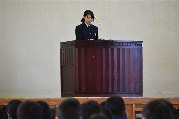 11月25日、生徒会役員改選の演説会が行われました。生徒会長候補1名、副生徒会長候補2名と応援者による演説でした。それぞれ現在の学校について感じていることなどを述べ、これからどのような学校づくりをしていくかを全校生徒へ向けて伝えました。3年生から下級生へ、バトンタッチの時期がきたことを実感させられました。生徒一人一人、学校のことを考えるよい機会になったのではないでしょうか。