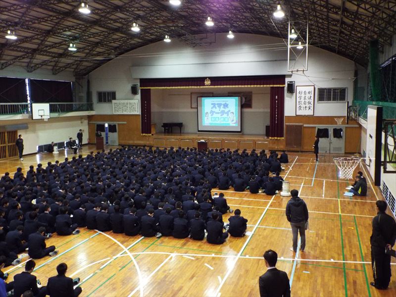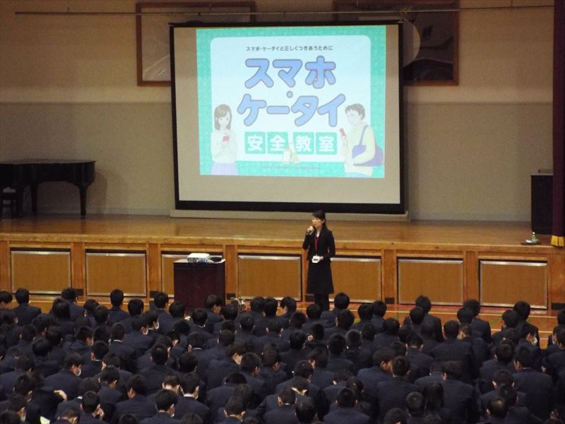 1月24日(火)7限目に(株)NTTドコモ スマホ・ケータイ安全教室事務局の方々を講師としてお招きし、「情報モラル講演会」を実施しました。生徒達は真剣に聴いており、ネット上でのトラブルや事件・事故を未然に防止するための情報モラルの向上に繋がったことと思います。